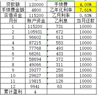 那么第一个月,你能借给你朋友的钱,是12万减去4800块,为115200元,利息是576元,你应还银行一万元。我们心狠一点,假设你利滚利,乙给你的利息你继续贷给他。