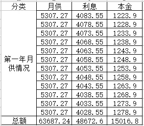 如图2所示,第一年12个月,累计还款金额是63687元,其中利息支出是48672元,本金支出是15016元,本金远少于利息,乍一看好像是在支持那个错误的理论。