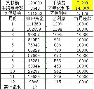 这里面的原理,是因为虽然你初始只交了4%的手续费,但是这个4800是按照你第一个月的贷款额确定的,无论是立刻付手续费,还是把这4800折算进12个月慢慢付,都无所谓了,但是后续你每个月交了1万的钱给银行,到了第6个月,你实际只占用了银行六万本金,这个时候银行依然是按照你12万的4%手续费来计算的你全年的利率,那当然明显不合理。