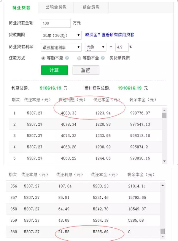 如图1所示,贷款一百万,第一个月还款5307,其中4083全部是利息,你依然背负巨债。最后一个月也还款5307,利息只有21.58,还的全是本金。