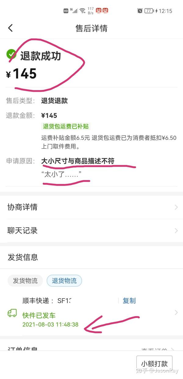 你说,又要考核我们DSR提升领航员体验分,经常遇到这种秒退货的,拍大或者拍小了,给你整个大小尺寸描述不符,或者材质与商品描述不符,或者颜色与描述不符,后台又说你哎呀消费者体验分变差了呀什么的,你说,商家能怎么选择,连驳回的选项都没有,而且一揽件就秒退款,是说这俩月怎么多多用户这么优质这么有钱了,退货都用顺丰快递 ,前两天才听朋友说,寄顺丰超出运费险的部分,平台是自动从商家账户里扣钱给他们的,都不会通知你。。。