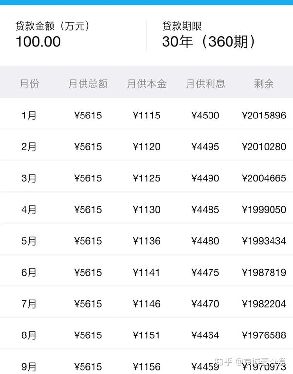 等额本金:每个月还的本金一样,利息逐渐减少这里以贷款100万,30年还款为例,看看怎样还款更划算?