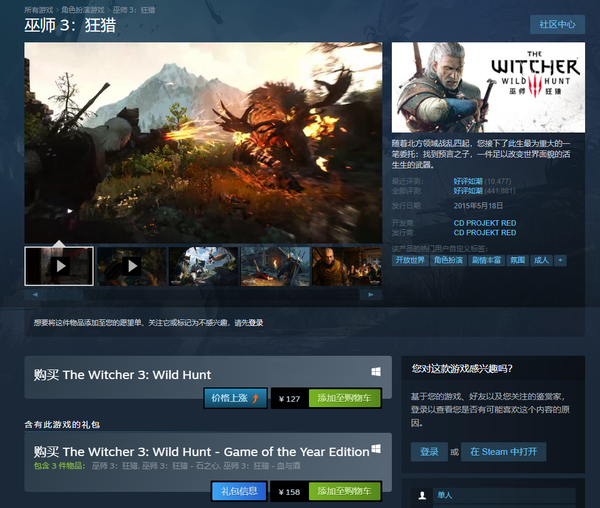 《巫师3》在steam上价格127,常年打折78,历史最低价38,四舍五入就是白捡,但却能给你带来长达200小时在中世纪的狩魔冒险和史诗级的三角恋体验。
